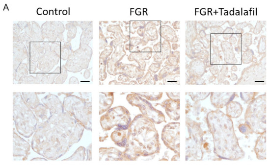 Table 1 shows the clinical data of the samples used in this study. The placentas used in this study were categorized into three groups. The FGR + tadalafil group (n = 12) included FGR placentas that were treated with tadalafil during the pregnancy period. The FGR group (n = 10) received no tadalafil treatment. The control group (n = 14), on the other hand, was without FGR and was managed for pregnancy and delivery at the same period in the institution.