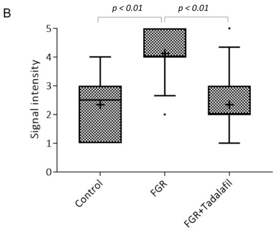 The hypoxic conditions in the placentas were investigated through the evaluation of the expression of HIF-2α (Figure 1). The signal intensity of HIF-2α protein was significantly higher in the FGR group than in the control group (control 2.3 ± 0.18 and FGR 4.1 ± 0.15, p < 0.01). In contrast, HIF-2α protein expression significantly decreased in the FGR + tadalafil group as compared with that in the FGR group (FGR 4.1 ± 0.15 and FGR + tadalafil 2.3 ± 0.17, p < 0.01), and no significant difference was observed between the FGR and control groups (p > 0.99).