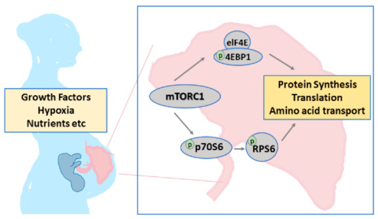 Representation of placental mammalian target of rapamycin (mTOR) signaling. Placental mTOR signaling changed downstream of mechanistic target of rapamycin complex 1 (mTORC1) in response to oxygen and nutritional status. The proteins rpS6 and eIF-4E, which act downstream of mTOR signaling, were involved in protein synthesis, translation, and amino acid transport.
