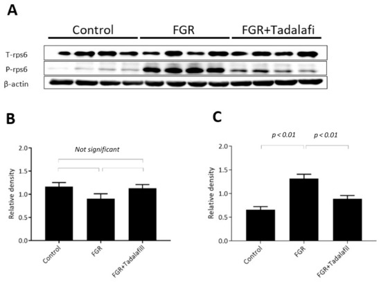 No significant difference was observed in total rpS6 protein expression among the three groups (control: 1.167 ± 0.08772, FGR: 0.9043 ± 0.1084, FGR + tadalafil: 1.132 ± 0.0789; one-way ANOVA p = 0.1359; Figure 3B). On the other hand, the expression of phosphorylated rpS6 (Ser235/236) was significantly higher in the placenta samples from the FGR group than that in the placenta samples from the control group (control: 0.659 ± 0.06485, FGR: 1.32 ± 0.09076, FGR + tadalafil: 0.890 ± 0.06799; one-way ANOVA p < 0.01, post hoc Tukey p < 0.01 for control versus FGR, p = 0.06 for control versus FGR + tadalafil, and p < 0.01 for FGR versus FGR + tadalafil; Figure 3C).