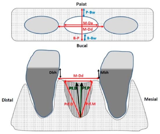 Measurements of the remaining alveolar rim performed with a millimeter probe. B-P: palatal–lingual crest width; P-Bw: palatal bone table width; B-Bw: buccal bone board width; M-Da: alveolus width; M-Dd: width of space between teeth (if both are present); Mbh: height crest cement of the adjacent mesial tooth; Ddh: height crest cement of the adjacent distal tooth; Pf.B: depth to the oral edge; Pf.P: depth to the palatal edge; Pf.M: depth to the mesial edge; Pf.D: depth to the distal edge.