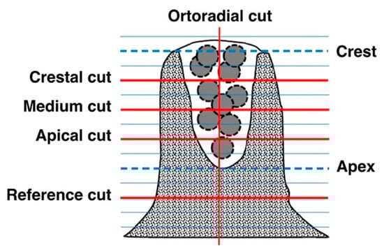 The radiodensity of the alveoli filled with the experimental and control material was measured using computed tomography as shown in Figure 2 (PaX-Flex 3D, Vatech, Gyeonggi-do, South Korea). The cutting plane ran parallel to the palatal vault and the sweep interval was located between the alveolar ridge and the palate itself, recording and 1.5 mm thick sections with 1 mm spacing. Section selection and radiodensity measurements were performed using DicomWorks software. The measurements included total socket depth and the average of the 3 values was calculated. The radiodensity of the adjacent bone was measured in a section placed 2 mm above the alveolar apex (Figure 3). The measurements were made at 0–5 days and at 175 ± 5 days.