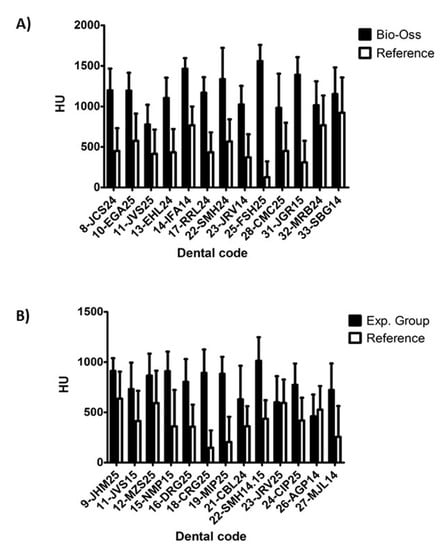Density difference (HU) of alveoli treated with Bio-Oss® (A), and with experimental material (B). The graphs represent the mean bone density in Housfield (HU) of the regenerated sites regenerated half alveoli = (Cc + Cm + Ca + Co)/4 and their corresponding reference measures: means of reference = (Cra + CRc)/2.