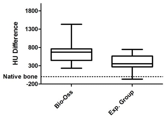 Difference in HU between Bio-Oss and Experimental group. The Whisker diagram indicating the median (inside the boxes) ± the first and third quartiles (box limits) and the error bars represented the minimum and maximum value. The values represent the difference in HU with respect to the proper bone taken as a reference (zero value) represented by the dashed line.