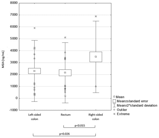 In turn, MDA serum concentration was highest in patients with right-sided tumor location. There were statistically significant differences in MDA serum concentration and the primary tumor location in the colon (left or right side) or rectum (Kruskal–Wallis ANOVA; p = 0.026). A two-sided post hoc test with Bonferroni correction revealed statistically significant differences in MDA levels in the left and right side of the colon (p = 0.026), as well as in the right side of the colon and rectum (p < 0.015) (Figure 1, Table 2).