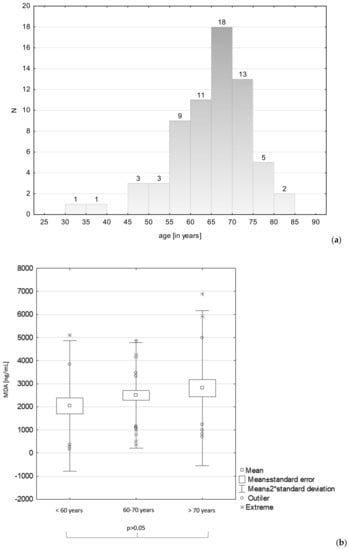 The intensity of lipid peroxidation was evaluated taking into account patients’ age (Figure 2b). Based on the Kruskal–Wallis ANOVA, no statistically significant differences were found in the MDA serum concentration and age (p = 0.35), but the mean MDA serum concentration was the highest in the oldest patients (i.e., those over 70 years of age).