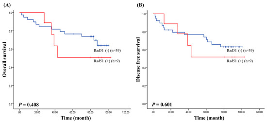 We next assessed survival to determine the prognostic value of RAD51 expression in CRC. The median follow-up of patients for survival analysis was 67.76 months (range of 2–102 months). Survival results by the Kaplan–Meier analysis showed that the RAD51 expression was not associated with the overall survival (p = 0.408; Figure 1A) and disease free survival (p = 0.601; Figure 1B) in CRC.