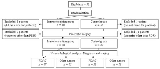 For comparisons, patients were stratified into the following groups: (1) immunonutrition vs. control group; (2) PDAC vs. other pancreatic tumours group; (3) patients with malnutrition vs. patients without malnutrition.