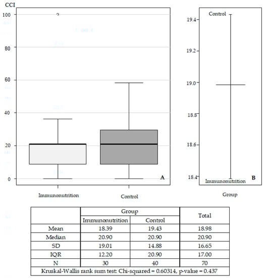 Standard deviations (A) and mean (B) of the comprehensive complication index (CCI) in the immunonutrition and control groups (n = 70).