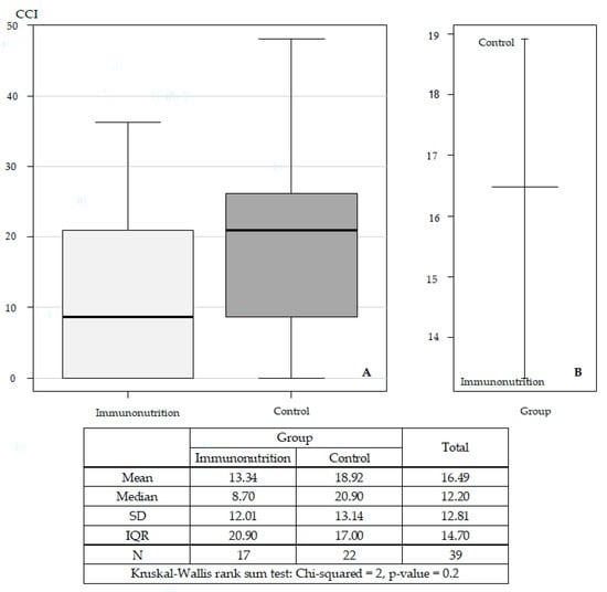 In PDAC patients segregated according to immunonutrition, median CCI was 8.7 in the immunonutrition group (n = 17), while median CCI was 20.9 in the control group (n = 22); however, the difference was not statistically significant (p = 0.2) (Figure 3).