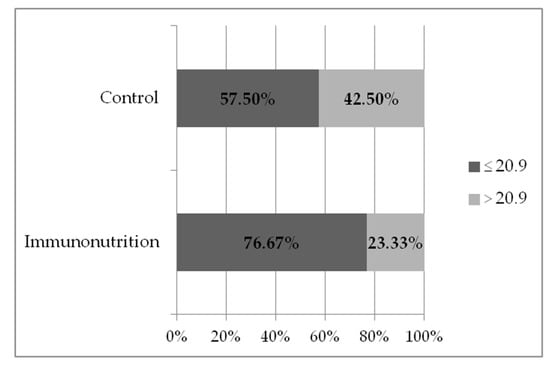 Rate of severe and/ or multiple complications (CCI > 20.9) in immunonutrition vs. control groups (n = 70) (p = 0.006).