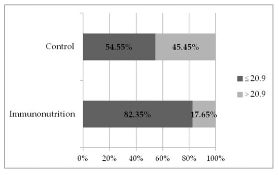 Overall, 34.3% (n = 24) of patients had CCI > 20.9:23.3% (n = 7) of patients in the immunonutrition group and 42.5% (n = 17) in the control group; the difference between the groups was statistically significant (McNemar’s chi-squared = 7.5, p = 0.006) (Figure 4). Even more significant differences of severe and/or multiple complication rates were obtained when PDAC patients were segregated into immunonutrition (n = 17) vs. control (n = 22) groups: CCI > 20.9 was found in 17.65% of patients in the immunonutrition group and in 45.45% of patients in the control group (McNemar’s chi-squared = 4.3, p = 0.04) (Figure 5).