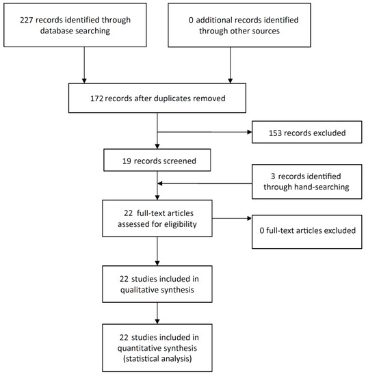 The study selection process is summarized in Figure 1. The search strategy in the databases resulted in 227 papers, three papers through hand-searching, and no additional eligible papers were found in Google Scholar. In the end, a total of 22 publications were included.