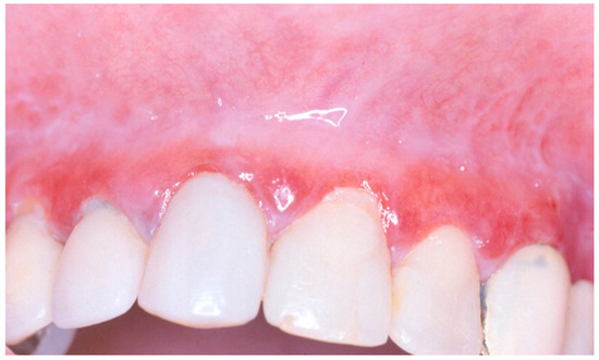 Typical clinical presentation of OLP erosive type, on the gingiva of maxillary anterior teeth.