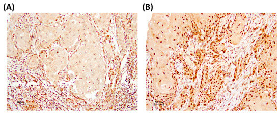 Representative immunostaining of KLF17 in OSCC specimens. Nuclear KLF17 expression levels were (A) low and (B) high.