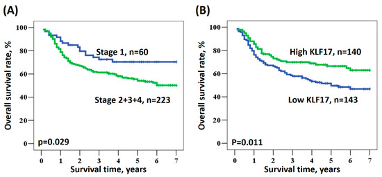 Kaplan–Meier survival curves for patients with oral squamous cell carcinoma (OSCC) according to (A) OSCC stage and (B) KLF17 expression.