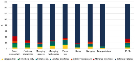 The research revealed that people dealing with more serious cognitive difficulties were more dependent during their daily instrumental activities and ordinary daily activities (Spearman’s rank correlation for all activities was in range from 0.33 to 0.62, p < 0.0001). The strongest links were observed between the cognitive skills and medication management (R = 0.62), finance management (R = 0.54), and ordinary housework (R = 0.53). The weakest but still reliable link was revealed between cognitive skills and meal preparation (R = 0.33).