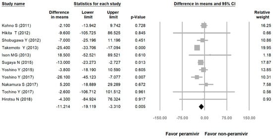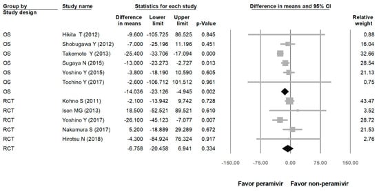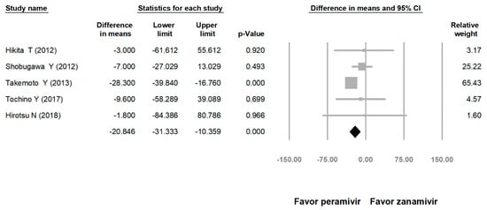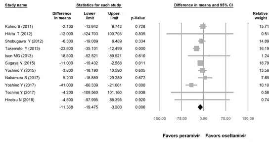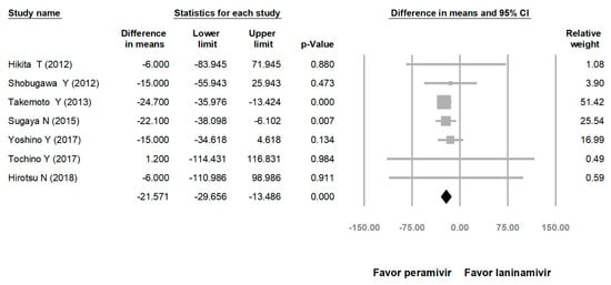 This meta-analysis included five RCTs and seven OSs that involved a total of 2681 patients. The results indicated that peramivir reduced the time to the first alleviation of symptoms; thus, the efficacy of peramivir might be superior to that of other NAIs. However, subgroup analysis of study designs determined the higher efficacy of peramivir than other NAIs with respect to time to alleviation of symptoms only applied to OSs, but not RCTs. Therefore, our findings suggest that peramivir should have at least similar or even higher efficacy than other NAIs. In addition, we compared the efficacy of peramivir with each NAI, including oseltamivir, zanamivir, and laninamivir. Pooled analysis indicated that the efficacy of peramivir was higher than that of the other NAIs. This result is consistent with that of a recent meta-analysis by Lee et al. that included two RCTs and five OSs that compared the efficacy of intravenous peramivir with that of oral oseltamivir for influenza treatment []. That study found that peramivir might reduce time to alleviation of fever more effectively than oral oseltamivir. This meta-analysis compared the efficacy of peramivir with that of other NAIs in various age groups and revealed that peramivir achieved significantly higher efficacy than other NAIs in the less than or equal to 18 years group, but no significant difference was evident in the more than 18 years group. Lee et al. [] discerned no significant difference in efficacy between peramivir and oseltamivir in adults, which is consistent with our finding. However, they could not perform child-specific analysis because they included only one study involving children. In summary, our finding suggests that the efficacy of peramivir is superior to that of other NAIs. This meta-analysis showed peramivir reduced the time to alleviation of symptoms by 12–24 h compared to other NAIs, these data potentially mean that peramivir can shorten hospitalization stays, decrease medical costs, avoid complications, and return patients to normal life quickly. However, this finding should be confirmed in additional studies.