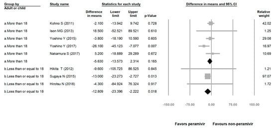 Comparing the peramivir and nonperamivir groups, the overall MD of time to alleviation of symptoms was −11.214 h (95% confidence interval (CI): −19.119 to −3.310, p = 0.005; Figure 2). We conducted subgroup analyses in which the included studies were separated into RCTs and OSs. Peramivir had higher efficacy for time to alleviation of symptoms (MD = −14.036 h, 95% CI: −23.126 to −4.945, p = 0.002) in pooled analysis of OSs but not in pooled analysis of RCTs (MD = −6.758 h, 95% CI: −20.458 to 6.941, p = 0.334; Figure 3). In addition, the peramivir group exhibited significantly shorter time to alleviation of symptoms than the oseltamivir group MD = −11.338 h, 95% CI: −19.475 to −3.200, p = 0.006, Figure 4; peramivir vs. zanamivir: MD = −20.846 h, 95% CI: −31.333 to −10.359, p < 0.05, Figure 5; peramivir vs. laninamivir: MD = −21.571 h, 95% CI: −29.656 to − 13.486, p < 0.05, Figure 6. We then determined the efficacy of NAIs for various age groups. The less than or equal to 18 years group exhibited a significant favor towards peramivir (MD = −12.809 h, 95% CI: −23.396 to −2.222, p = 0.018), and the more than 18 years group exhibited favor towards peramivir, but without statistical significance (MD = −5.630 h, 95% CI: −13.573 to 2.314, p = 0.165; Figure 7).