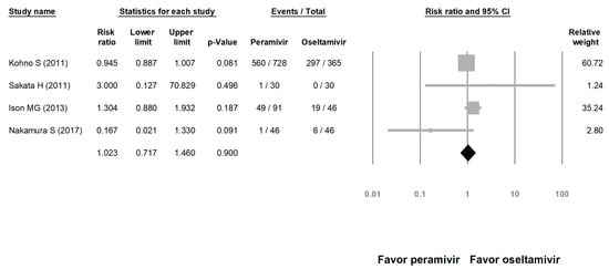 Currently, four NAIs, namely oseltamivir, zanamivir, peramivir, and laninamivir, are available. Among them, peramivir is the only NAI administered intravenously, and it has been approved to treat nearly all patients, unless injection is contraindicated. Therefore, peramivir could be a useful option of treatment for most patients with severe symptoms [,]. However, recent meta-analysis [] comparing peramivir to oseltamivir only determined the efficacy on an adult group.