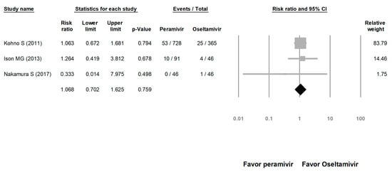 We assessed the risks of overall AE and SAE. The risk of AE in the peramivir group was similar to that in the oseltamivir group (risk ratio (RR) = 1.023, 95% CI: 0.717 to 1.460, p = 0.900; Figure 8). The risk of SAE was similar between the peramivir and oseltamivir groups (RR = 1.068, 95% CI: 0.702 to 1.625, p = 0.759; Figure 9).
