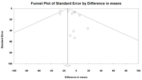 Overall heterogeneity, according to MD’s I2 tests, was 46.1%, and heterogeneity based on subgroup analysis of RCT and OS study designs was 33.2% and 44.3%, respectively. Comparing peramivir with oseltamivir, zanamivir, and laninamivir, heterogeneity was 50.6%, 4.2%, and 0%, respectively. The overall publication bias, as assessed using funnel plots (Figure 10) and Egger’s test (p = 0.248), was not significant. Next, we used sensitivity analysis to investigate the high heterogeneity. After excluding two studies [,], the heterogeneity of comparing peramivir with oseltamivir through I2 tests was 0%. The RR of heterogeneity for AEs and SAEs, as determined through I2 tests, was 47.4% and 0%, respectively. The RR of publication bias, assessed through Egger’s test, was not significant between AEs and SAEs (p = 0.891 and p = 0.609, respectively).