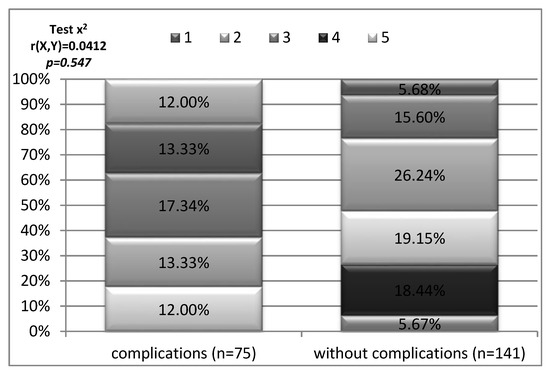 The group of patients participating in the study who had postoperative wound healing complications assessed their level of pain at 7 points and above on the NRS scale. It was a higher pain rating than in the group of patients without complications in postoperative wound healing. No statistical significance was observed (Figure 1).
