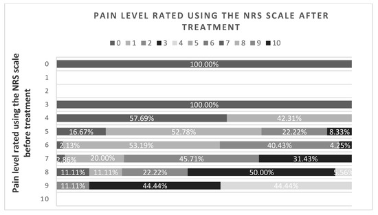 The applied methods of analgesic treatment used in the departments studied were effective, significantly reducing the level of perceived pain (Test χ2, r(X,Y) = 0.7488, p = 0.0001). All patients assessing the level of pain before treatment from 0 to 2 rated it at 0 on the NRS scale after treatment; among those assessing the pain level at 3, 57.69% indicated 0 and the remaining patients indicated 1 after treatment. In the group of people experiencing pain at 5 and 6 points before receiving medication, more than 90% indicated pain below 3 on the NRS after treatment. Patients evaluating pain at 9 points indicated a maximum of 4 (44.44%) after treatment (Figure 2).