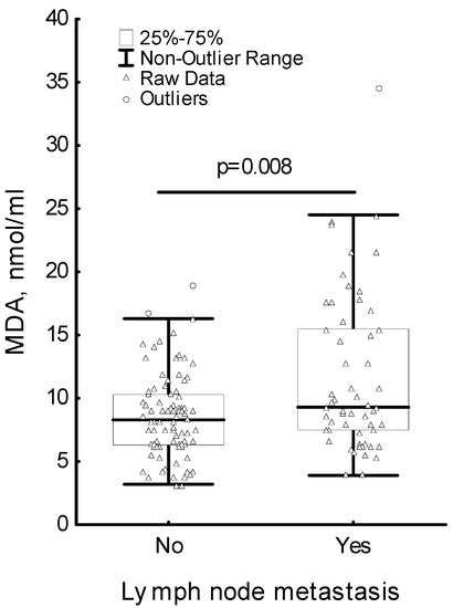 - Szychta, P.; Zadrozny, M.; Lewinski, A.; Karbownik-Lewinska, M. Increased oxidative damage to membrane lipids following surgery for breast cancer. Neuro Endocrinol. Lett. 2014, 35, 602–607. [Google Scholar]