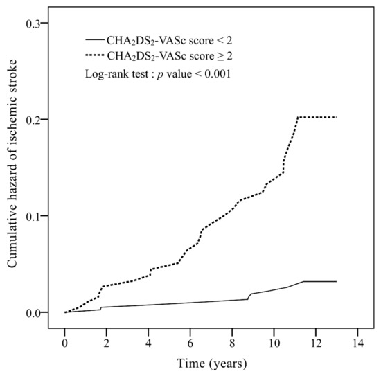 The CHADS2 score was calculated according to the following algorithm with five variables: congestive heart failure (ICD-9-CM code 428, 1 point), hypertension (ICD-9-CM codes 401–405, 1 point), age ≥ 75 years (1 point), diabetes (ICD-9-CM code 250, 1 point), and prior ischemic stroke/transient ischemic attack (ICD-9-CM codes 433–438, 2 points). The CHA2DS2-VASc score was calculated according to the following algorithm with 8 variables: Congestive heart failure (ICD-9-CM code 428, 1 point), hypertension (ICD-9-CM codes 401–405, 1 point), diabetes (ICD-9-CM code 250, 1 point), age ≥ 75 years (2 points), prior ischemic stroke/transient ischemic attack (ICD-9-CM codes 433–438, 2 points), vascular disease (ICD-9-CM codes 410.x, 411.0, 412, 420.20–420.24, 429.79, 440.0, 440.20–440.24, 440.29, 440.30–440.32, 440.4, 443.81, 443.89, and 443.9), age 65–75 years (1 point), and female sex (1 point) [24,30,31].