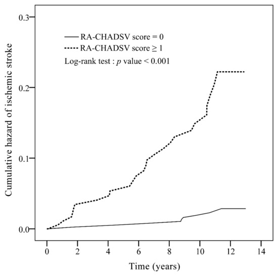 Patients were followed until first occurrence of ischemic stroke (ICD-9-CM codes 433.x1, 434 (excluding 434.x0), 435, and 436), [28,29] or the last available date in the database. The longest follow-up duration was up to 10 years. The CHA2DS2-VASc score was applied to evaluate the risk of ischemic stroke among RA patients without AF.