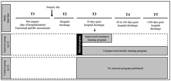 The BIVA follow-up reports a shift to the right after the surgery in both groups, possibly reflecting a reduction in body fluids and BCM (defined as metabolically active tissues in the body including muscle cells, organ cells, blood cells and immune cells) []. The displacements of the vectors that occur in both groups in T3 may be due to an increase in body fluids, while the different behaviors from T3 to T4 would reflect an increase in both body fluids and BCM. Despite the fact that after T3 the exercise program was not supervised and that both groups returned to vector values close to the baseline from T4 to T5, the different vector behavior from T3 to T4 could reflect the beneficial effect of following an exercise program, which could allow a faster recovery compared to the control group.