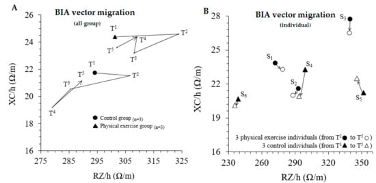 The individual assessment of BIVA migration shows that the exercise group has a similar trend in all three subjects. At the end of the study, the subjects who followed the training program were placed lower in the RXc graph than the position recorded at the baseline. This could be due to an increase in body water, due to a concomitant increase in RZ and a decrease in XC over time. As for the control group, the vector migration from T1 to T5 shows three different behaviors. In addition, the displacements appear more pronounced than in the exercise group. Therefore, is possible to speculate that exercise is able to transmit changes in body composition in a more homogeneous way, even in subjects with different anthropometric profiles.