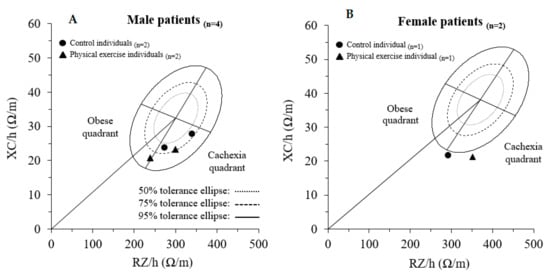 Pre-surgery individual BIVA, according to the corresponding healthy reference population. (A) shows the vectors of male patients and (B), the vectors of female patients. RZ/h, height-adjusted resistance; XC/h, height-adjusted reactance.