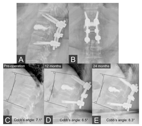 | Case No. | Sex/Age | Level of Fracture | Blood Loss | T Score | VAS Change * | Sagittal Cobb’s Angle † |