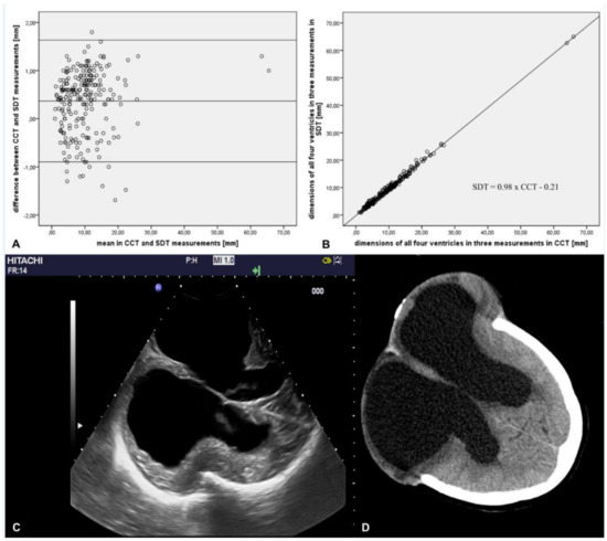 - Bendella, H.; Maegele, M.; Hartmann, A.; Spreer, J.; Rommel, N.; Lefering, R.; Nakamura, M.; Igressa, A. Cerebral ventricular dimensions after decompressive craniectomy: A comparison between bedside sonographic duplex technique and cranial computed tomography. Neurocrit. Care 2017, 26, 321–329. [Google Scholar] [CrossRef] [PubMed]