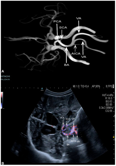 - Becker, G.; Lindner, A.; Bogdahn, U. Imaging of the vertebrobasilar system by transcranial color-coded real-time sonography. J. Ultrasound Med. 1993, 12, 395–401. [Google Scholar] [CrossRef]