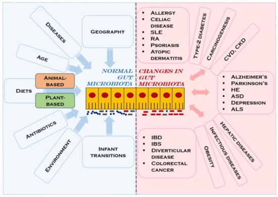 An imbalance or alteration in microbial composition and activity, also called “gut microbiota dysbiosis”, has been associated with several clinical manifestations, although it is not yet clear if dysbiotic patterns are the cause or the consequence of the disease []. These disorders include obesity, type-2 diabetes mellitus, neurological and neuropsychiatric cormobidities (Alzheimer’s and Parkinson’s diseases, hepatic encephalopathy, autism spectrum disorder, depression, amyotrophic lateral sclerosis), allergy, carcinogenesis, autoimmune diseases (celiac disease, systemic lupus erythematosus, rheumatoid arthritis, psoriasis, atopic dermatitis), infectious diseases (Clostridium difficile infection), cardiovascular disease, and chronic kidney, hepatic, and gastrointestinal diseases [,,,,,,,,]. Among the most common disorders of the gastrointestinal tract related to gut microbiota dysbiosis are the two major types of inflammatory bowel disease, ulcerative colitis and Crohn’s disease []. Irritable bowel syndrome, diverticular disease, and colorectal cancer have also been reported [] (Figure 1).