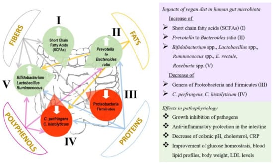 Apart from fibers, polyphenols, which are also abundant in vegan diets, increase both Bifidobacterium spp. and Lactobacillus spp., providing cardiovascular protection as well as antibacterial and anti-inflammatory effects []. Most of these compounds exhibit structural diversity, and consist of flavonoids, phenolic acids, stilbenes, lignans, and secoiridoids. They pass into the colon and are metabolized by colonic bacteria which influence their bioactivity, while a tiny proportion is possibly absorbed in the small intestine []. Fruits such as grape, blueberry, sweetsop, mango, and citrus, vegetables, medicinal plants, microalgae, herbs, seeds, cereals, and beverages including coffee, tea, cocoa and red wine are good sources of polyphenols []. Beneficial interactions between tea or soy isoflavones and intestinal microbiota have been reported, whereas wild blueberries—a good source of polyphenols—have been shown to increase Bifidobacterium and Lactobacillus species []. A decrease in pathogenic Clostridium perfringens and Clostridium histolyticum is probably attributable to the consumption of fruit, seed, tea, and wine polyphenols []. It has also been reported that proanthocyanidin-rich extract from grape seeds increased the number of Bifidobacterium spp. significantly, while genera of Enterobacteriaceae family were decreased []. In an another study the consumption of red wine was associated with an increase of bifidobacteria and species of the Enterococcus, Bacteroides, and Prevotella genera, whereas nonbeneficial bacteria such as Clostridium spp. were inhibited, providing possible prebiotic benefits of red wine polyphenols and resulting in the reduction of both cholesterol and C-reactive protein (CRP) []. A significant increase of high-density lipoproteins and decrease of CRP and triglyceride serum levels have also been reported after consumption of cocoa-derived polyphenols [] (Figure 2).