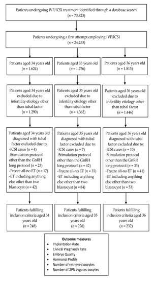 A total of 706 women were eligible to be included in the current study. Women were categorized to the respective age group based on their age during their first attempt. Thus, two-hundred and forty-eight women were included in the 34 years old group, 226 in the 35 years old group and the remaining 232 were included in the 36 years old group. In order to ensure that good prognosis patients were exclusively included in the data set of the current study, the inclusion criterion of an etiology of tubal factor infertility was endorsed. An idiopathic or unexplained infertility factor could present as a confounder, jeopardizing our results, hence a meticulous selection of patients based on their reproductive history was conducted. A flow chart on the study group selection process is presented in