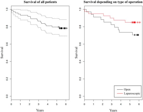 Survival and carcinoma recurrence five years after the initial operation are summarized in Table 2. We can observe some difference in percentage of vital statuses between the two groups: 29% dead in OCS group versus 15% in LAS group. Taking into consideration patients’ dates of deaths, we created two graphs of survival with Kaplan–Meier estimator (Figure 1). In both graphs, survival in dependence of years after the initial operation is shown. In the left graph survival of all patients is presented (solid curve) with 95% confidence interval (dashed curves). In the right graph, survival of the two investigated groups is shown separately (red and black solid curves belong to patients after laparoscopic operation and after open operation, respectively). Comparing the tendencies of the two surgical approaches we can see a slight difference, with LAS group having a minor advantage over OCS group. We have further compared survival using the log-rank test, which showed that there is no statistically significant difference between the two groups (p = 0.151).