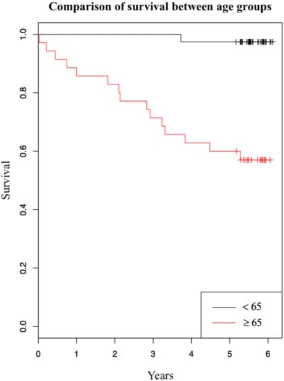 We have also investigated how patients’ age at operation affects their survival. Survival five years after the initial operation by age is summarized in Table 3. We can observe a strong effect of patients’ age on survival: Patients younger than 65 years at operation had a 97% survival rate opposed to patients that were 65 years or older that had a 57% survival rate. Using Kaplan-Meier estimator we have created a graph comparing survival between the two age groups (Figure 2). In the graph survival in dependence of years after initial operation is shown. The two curves represent patients in different age groups (red and black curves belong to patients aged 65 years or older at operation and to patients younger than 65 years at operation, respectively). We have further evaluated the effect of patients’ age on survival using Cox regression analysis. It showed that one-year older patient at operation had a 13,2% greater hazard ratio of dying in five years after the initial operation (95% CI: [1.06, 1.21]; p < 0.001), not regarding the type of operation.