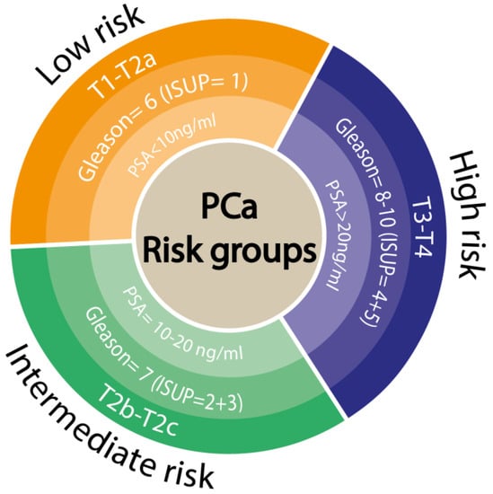 Prostate cancer risk groups classification for localized tumors, referring to biochemical recurrence according to European Association of Urology (EAU) Guidelines (2019).