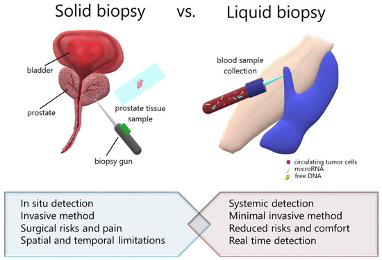 Figure 2 shows a comparison between solid and liquid biopsy highlighting the principles and properties of these two techniques. On one hand, the most used from a clinical point of view is the solid biopsy, which involves prostate tissue sampling and its anatomopathological analysis. This method is an invasive one and in some cases leads to surgical complications and pain. On the other hand, liquid biopsy may have a lack of risk implication alternatives and is starting to be applied in clinical diagnosis purposes. Biological fluid sampling implies minimal invasiveness and real time detection due to the advanced molecular biology techniques.