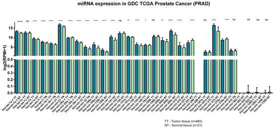 MiRNAs expression level in PCa tissue compared with normal adjacent tissue (The Cancer Genome Atlas (TCGA) database). All bar graphs are displayed as mean ± SEM and the p-values were evaluated by unpaired t test (ns > 0.05, * p < 0.05, ** p < 0.01, *** p < 0.001, **** p < 0.0001).
