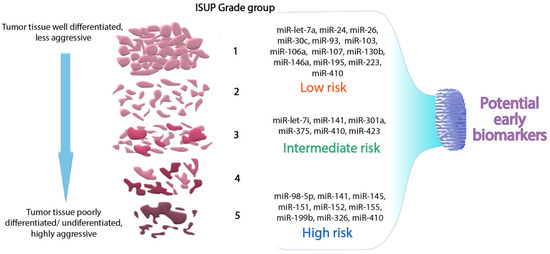 It is important to mention that miRNA expression levels from data extracted above regarding tissue samples of patients with PCa mostly follow the same trend in liquid samples. In the figure below (Figure 4) the most relevant miRNAs in early diagnosis estimation spread into ISUP Grade categories are represented.