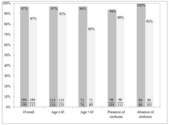 Stratifying patients by age (i.e., ≥65 vs. <65 years), comorbidities were more common in the elderly group, as expected. In particular, statistically significant differences were observed for the prevalence of hypertension (90/123 vs. 33/89, p < 0.001), diabetes mellitus (33/123 vs. 13/89, p = 0.03), cancer (25/123 vs. 5/89, p = 0.002), and cirrhosis (75/123 vs. 36/89, p = 0.003).