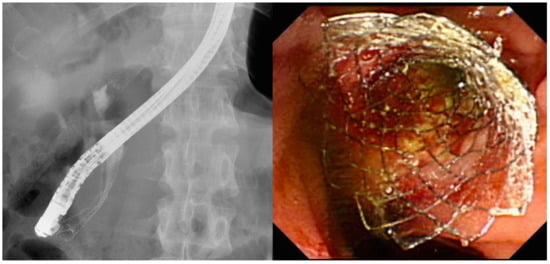 - Yokota, Y.; Fukasawa, M.; Takano, S.; Kadokura, M.; Shindo, H.; Takahashi, E.; Hirose, S.; Kawakami, S.; Fukasawa, Y.; Sato, T.; et al. Partially covered metal stents have longer patency than uncovered and fully covered metal stents in the management of distal malignant biliary obstruction: A retrospective study. BMC Gastroenterol. 2017, 17, 105. [Google Scholar] [CrossRef] [PubMed]