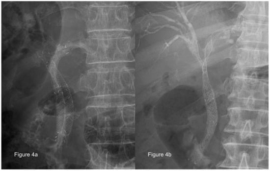 The evidence is still insufficient and no clear consensus has been reached regarding the benefits of unilateral versus bilateral drainage for hilar malignant obstruction, although the bilateral approach can be used by most experts using the SEMS stent-within-stent placement [,] with the newly designed Y-shaped devices, and this shows promising results [,]. These procedures can be performed using parallel [] (Figure 4a) or stent-in-stent [] (Figure 4b) deployment of SEMS, but not enough evidence is available to identify which method is preferable. Previous data have shown that draining 25% of the liver volume was sufficient to relieve jaundice []; however, a recent study indicated that patients who had liver volume drainage of >50% experienced greater jaundice relief than those who had a lower volume drained []. However, because the right lobe of the liver covers 55–60% of the liver volume, while the left and caudate lobes cover 30–35% and 10% of the liver volume, respectively [], draining >50% of the liver volume usually requires the use of bilateral stenting or multi-segmental stenting, depending on the individual patient’s anatomy.
