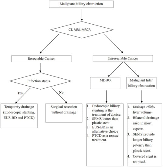 Differences in the level of obstruction of the biliary system allow for a further division of these kinds of problems into resectable or unresectable hilum or distal biliary obstructions. Computed tomography (CT), magnetic resonance imaging (MRI), magnetic resonance cholangiopancreatography (MRCP), and even endoscopic ultrasound sonography (EUS) should be used to evaluate the stage and primary source of a malignancy [,].